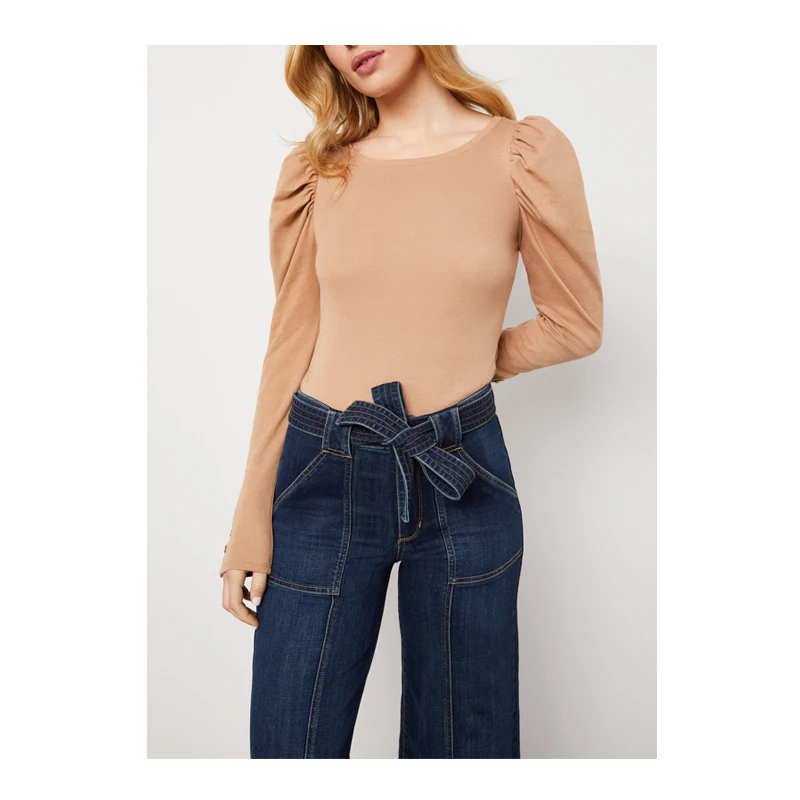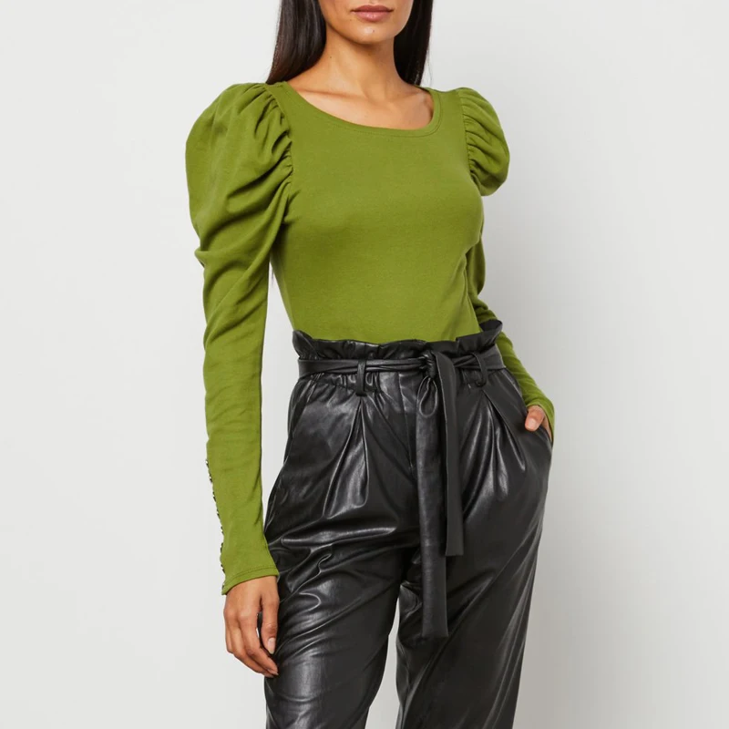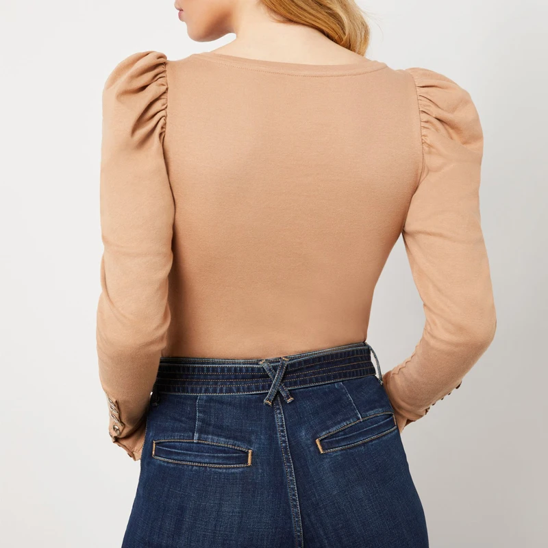 Button Long Puff Sleeve Round Neck Knit Bodysuit Tops for Women
